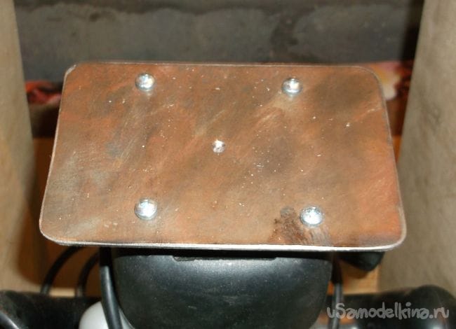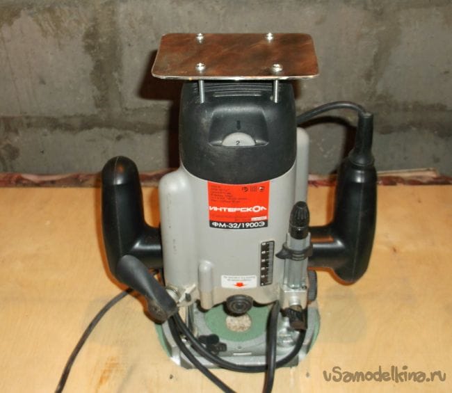Толкатель для фрезера сделал из 2 мм листа железа размером чуть больше задней крышки фрезера, четырех длинных болтов 4 мм и 8 гаечек для фиксации. Как видно на фото нагрузка равномерно распределена на четырех креплениях задней крышки фрезера и обеспечивается вентиляционный зазор между крышкой инструмента и основанием толкателя.