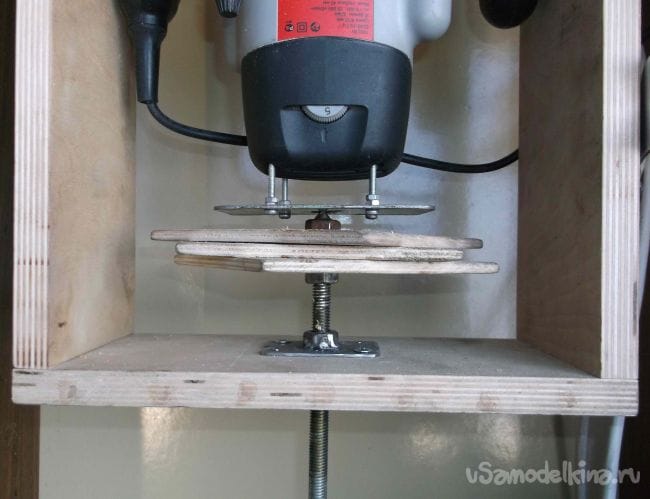 Следующий этап – лифт для фрезера. Изначально рассматривалось три версии: с верхней регулировкой, с регулировкой с помощью автомобильного домкрата, и при помощи резьбовой шпильки. С верхней регулировкой – удобный вариант, но требует изменения конструкции фрезера и наиболее трудоемкий, а так как это пробный вариант, пришлось отказаться. Лишнего автомобильного домкрата в наличии не оказалось, следовательно, вторая версия тоже отпала. Приступил к реализации третьей версии.