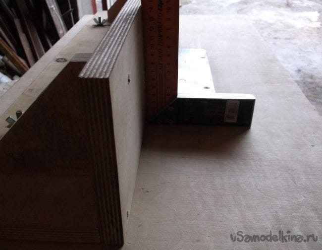 Параллельный упор начального уровня готов, осталось только проверить правильность установки угла 90 градусов, у меня изначально немного не совпало. Для регулировки угла под крепежные уголки подложил тонкие подкладки.