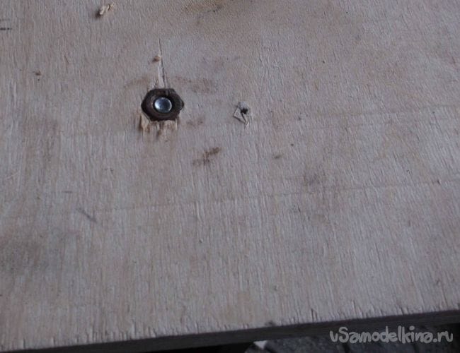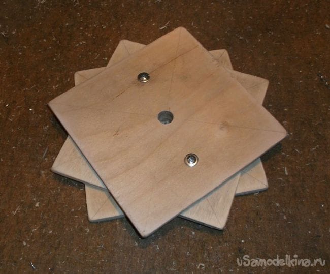 Вращение шпильки осуществляется не привычным диском, а наборным многоугольником, изготовленным из фанерных квадратов. Так, на мой взгляд, проще и удобнее. Фанеру использовал пятислойную, хотя и трехслойной фанеры вполне хватит.