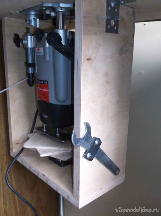 Каркас лифта закрепил к столу при помощи уголков. На каркасе лифта двумя саморезами закрепил полоску из кожи при помощи, которой крепится ключ для смены фрез. Проверил в работе – вылет фрезы регулируется плавно и точно.