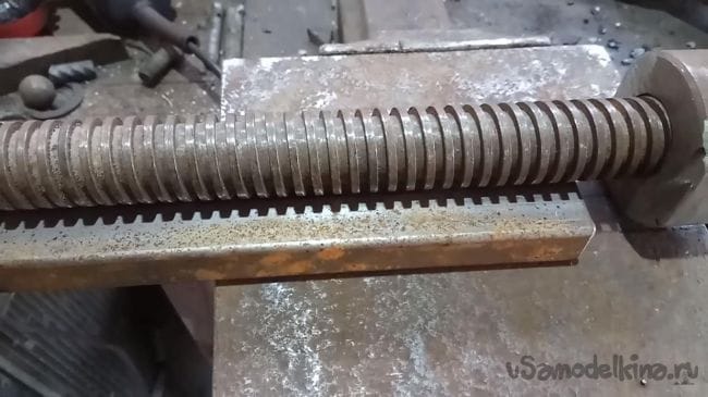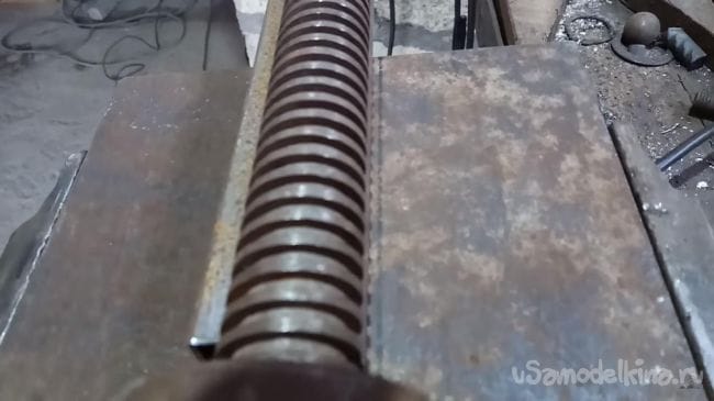 Время сделать сами губки тисков, материал для них был выбран не случайно, рессоры довольно прочные и имеют толщину 12 мм, что в самый раз для мощного инструмента. Делаем насечки для более лучшего сцепления детали в будущих тисках при помощи УШМ с отрезным диском толщиной 1 мм.
