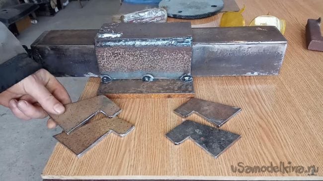 Когда все четыре детали выпилены, привариваем их, но делаем это немного под углом, чтобы увеличить ширину губок, она к слову равна 140 мм. Для удобства и точности можно сделать из профиля шаблон с необходимым углом, по которому будут приварены все четыре части.