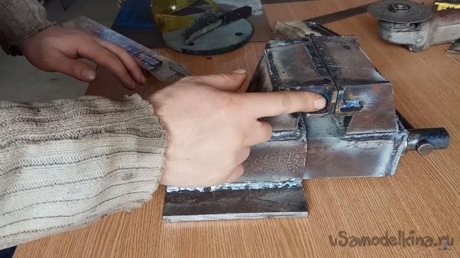 Не забываем про защитные очки при работе. Так выглядят тиски с разных сторон, еще нужно будет приварить 25-ые уголки, чтобы убрать острые углы в местах крепления губок.