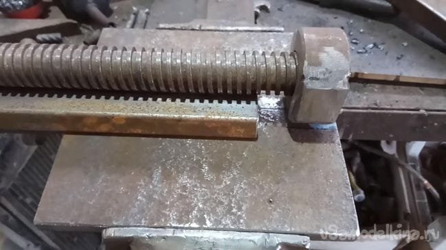 Для этого размечаем место, где она будет приварена, позиционируем ее посередине, сделав отступ от края около 5 мм. Чтобы винт перемещался ровно, подкладываем под него профиль с размерами 20*40 мм и прихватываем сваркой гайку к основанию, после чего уже основательно провариваем.