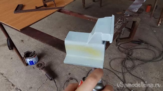 Теперь займемся внешним видом тисков. Сначала заклеиваем места, которые не нужно красить, это винт, гайка, губки и рукоять. После того, как все ненужные для покраски детали заклеены малярным скотчем начинаем грунтовать поверхность тисков. В данном случае использовался краскопульт, но если у вас его нет, так же как и компрессора, то баллончик грунтовки купить настолько просто, как и с краской.
