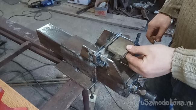 Привариваем несколькими точками П-образную часть, которую делали чуть ранее, к основанию строго посередине, а также прижимную пластину к подвижной части.
