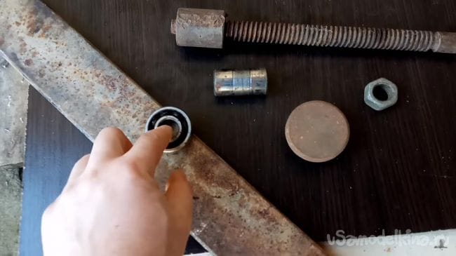 Первым делом нужно сделать подвижный механизм прижимной пластины. Делается это для того, чтобы при зажиме при помощи данной струбцины, прижимная пластина не вращалась вместе с винтом и не оставляла круговых следов на прижимаемой детали, а следовательно не протирала ее. Для этих целей было решено взять внутреннюю обойму радиального подшипника и установить на винт.