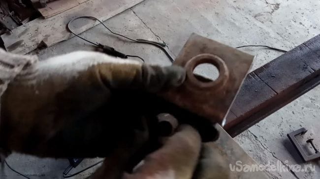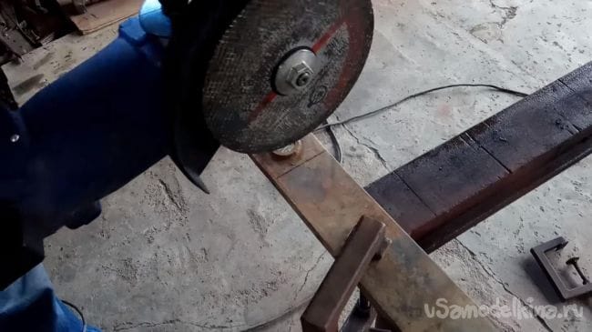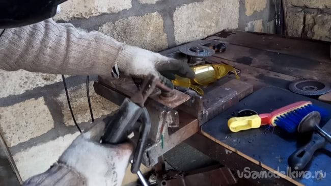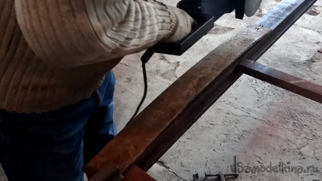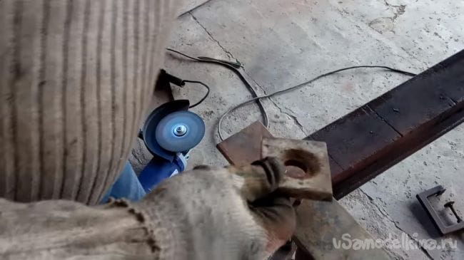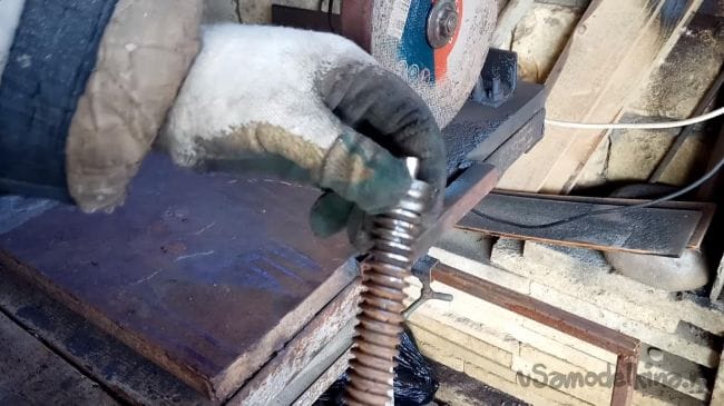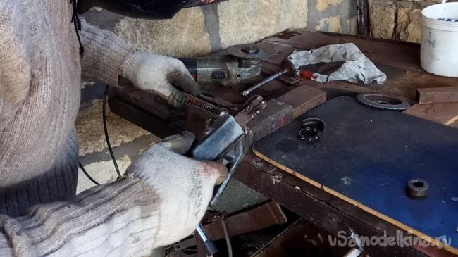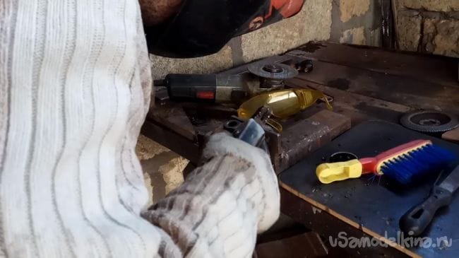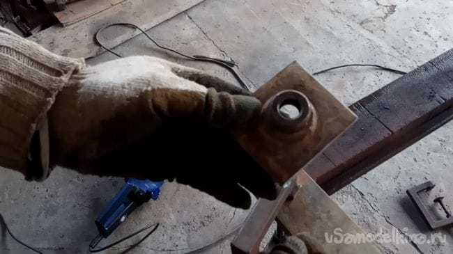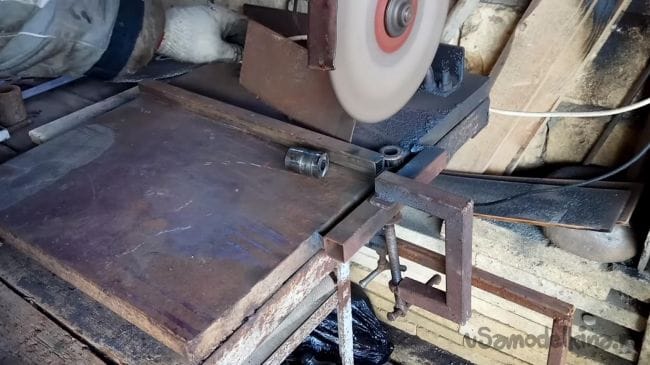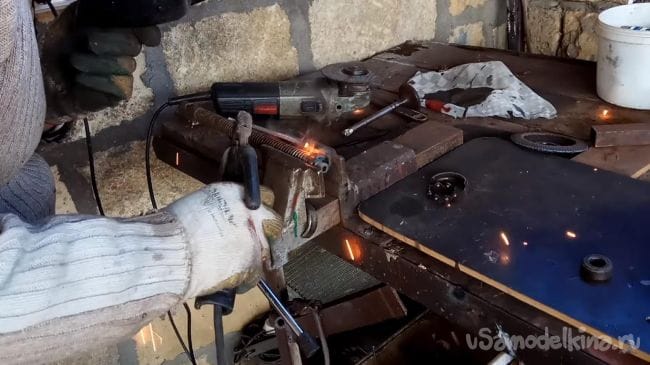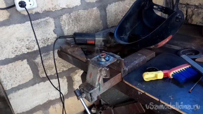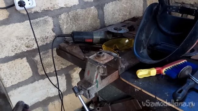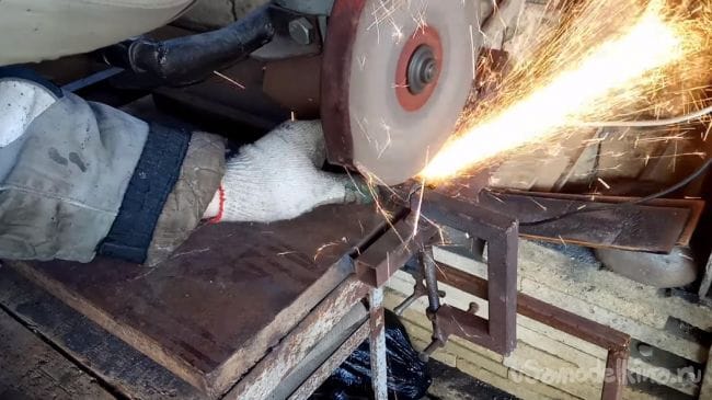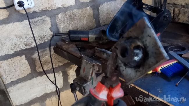 К данному отрезку необходимо приварить толстую пластину металла, которая и будет прижимной, ее отпиливаем при помощи углошлифовальной машинки.