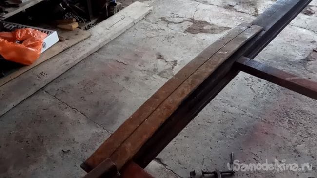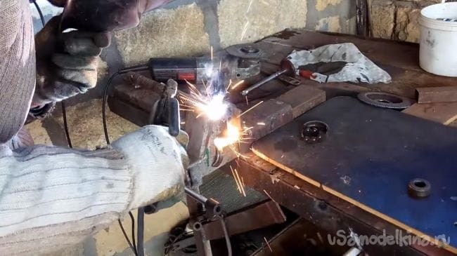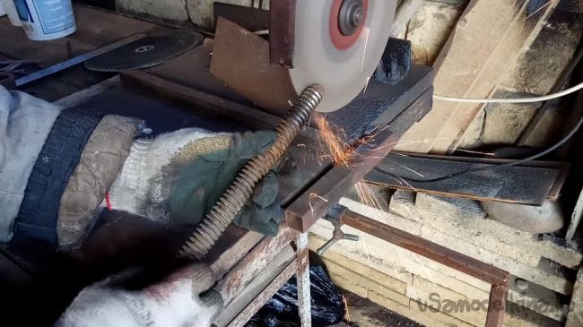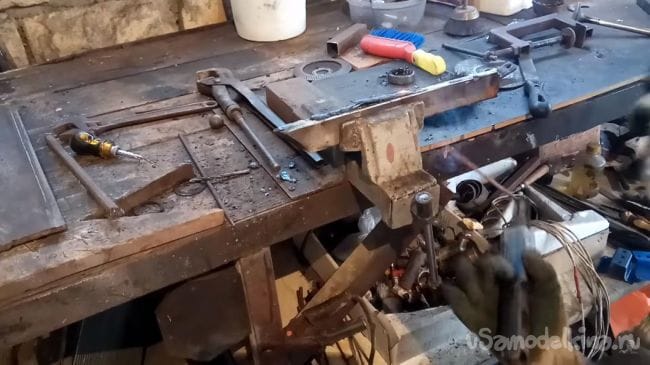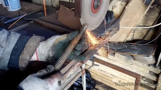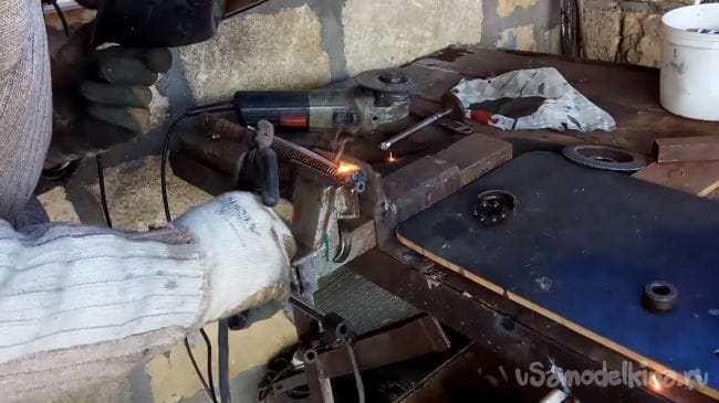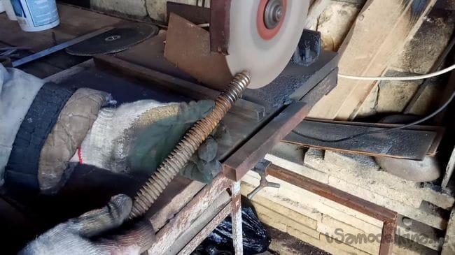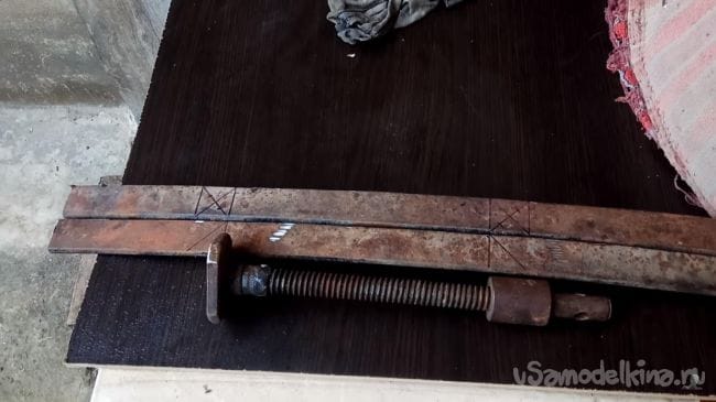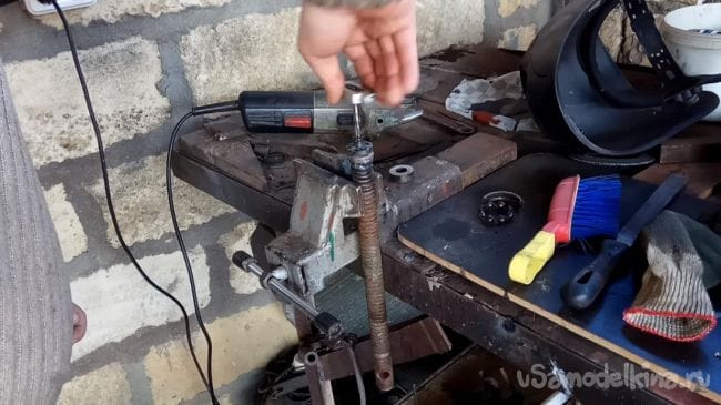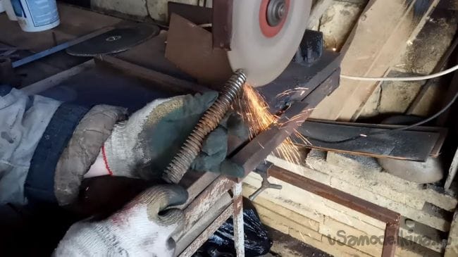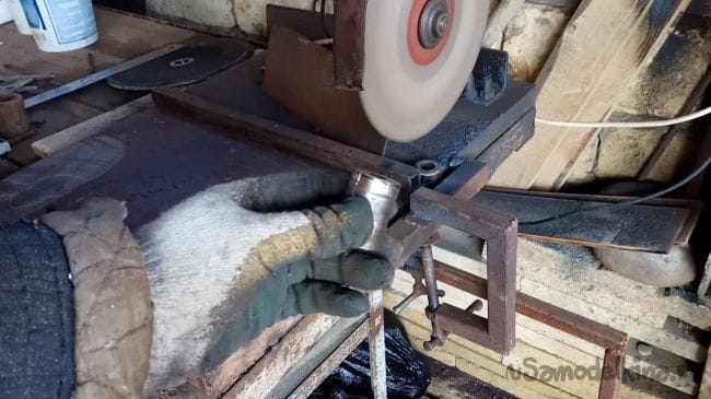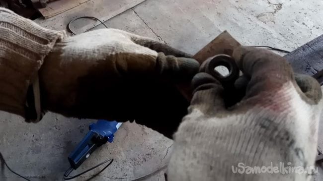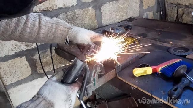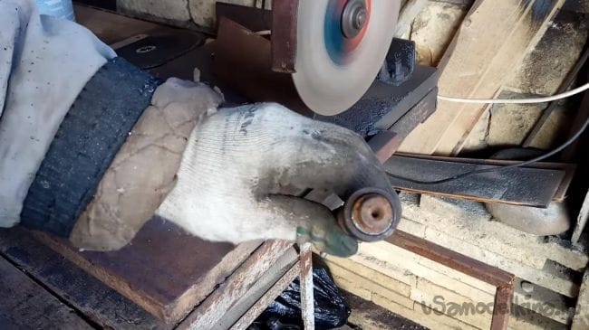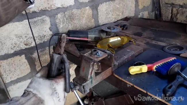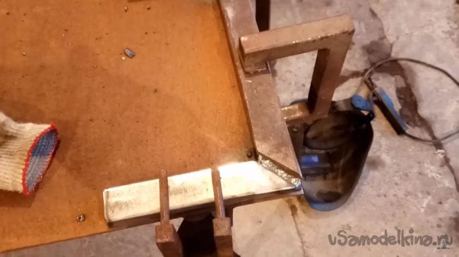 К данному отрезку необходимо приварить толстую пластину металла, которая и будет прижимной, ее отпиливаем при помощи углошлифовальной машинки.