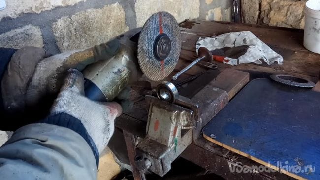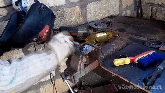 Теперь зажимаем винт в тисках и обвариваем со всех сторон внутреннюю обойму подшипника, посаженную на него ранее. При сварке не забывайте о защитной сварочной маске и крагах.