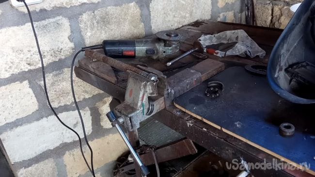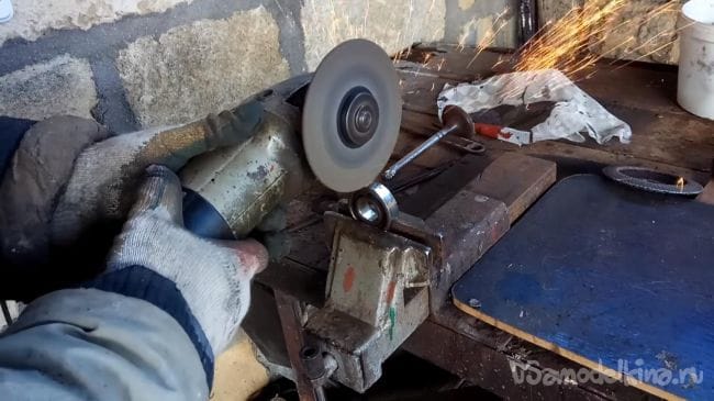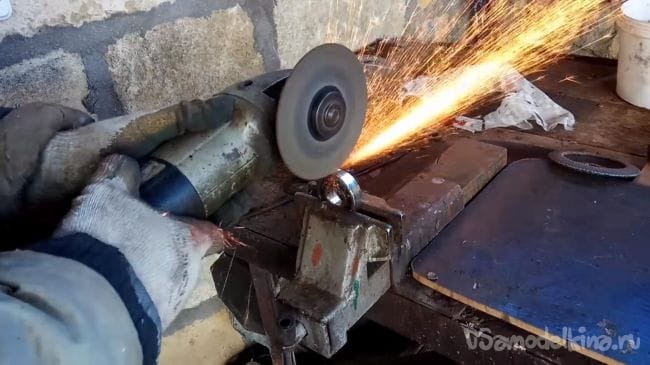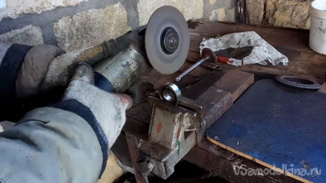 Чтобы добраться до внутренней обоймы, зажимаем подшипник в тиски и при помощи углошлифовальной машинки распиливаем наружную обойму в двух местах.