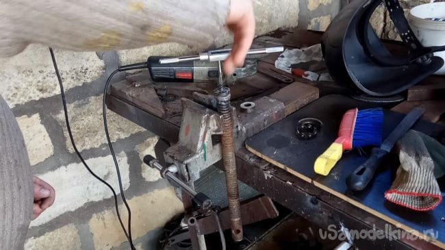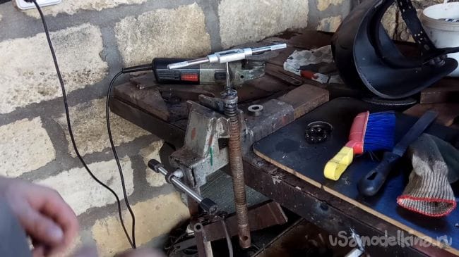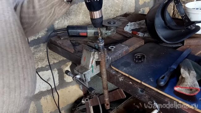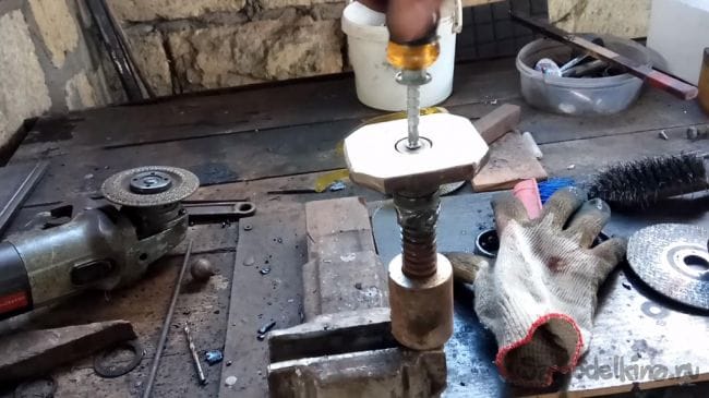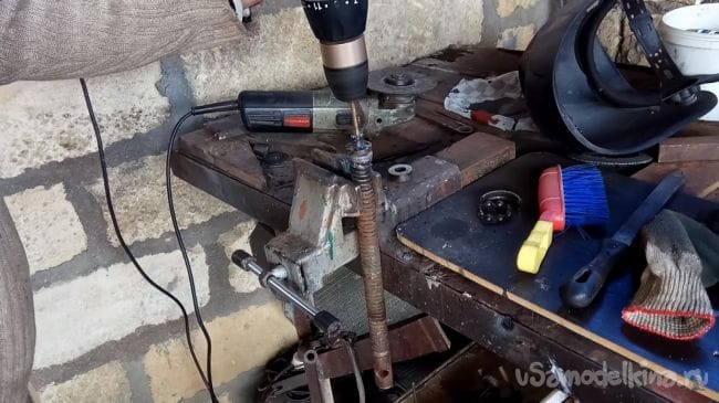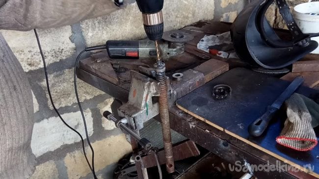 После сварки отбиваем шлак от сварочного шва любым металлическим предметом, например заостренным клапаном, сделанным специально для таких целей. В верхней части винта просверливаем отверстие под болт, делается это при помощи шуруповерта и сверла по металлу, в отверстие капаем машинное масло для облегчения процесса сверления и исключения перегрева сверла, если у вас есть специальное масло для этого, то лучше воспользоваться им.