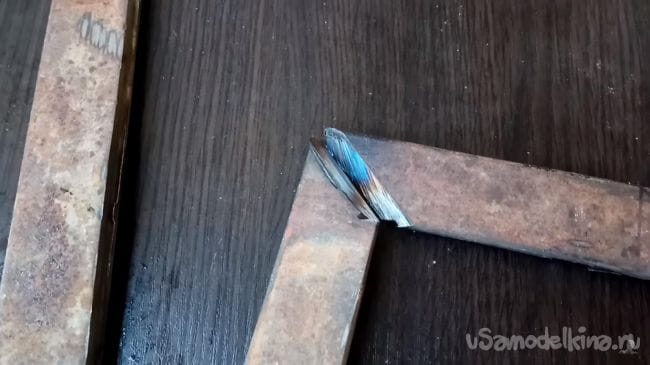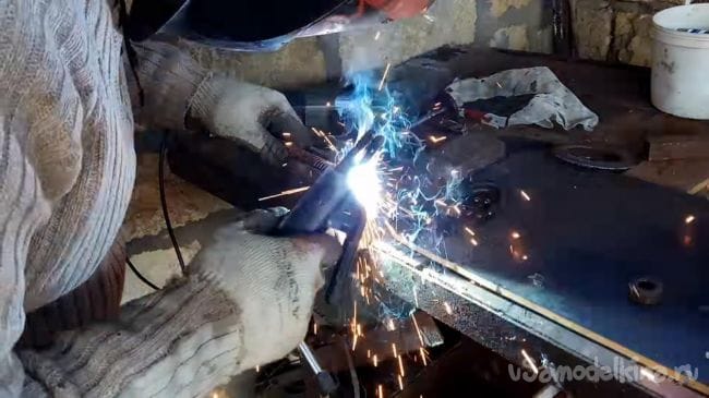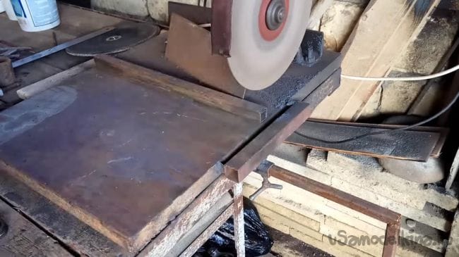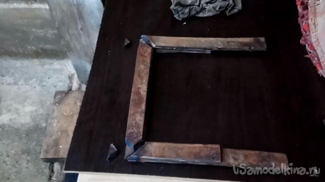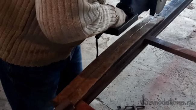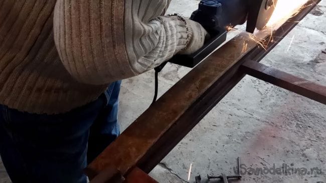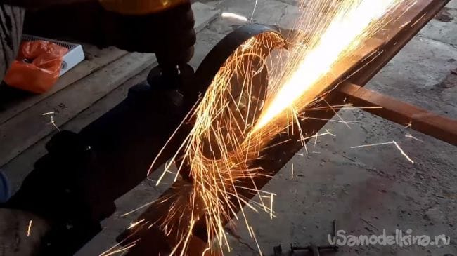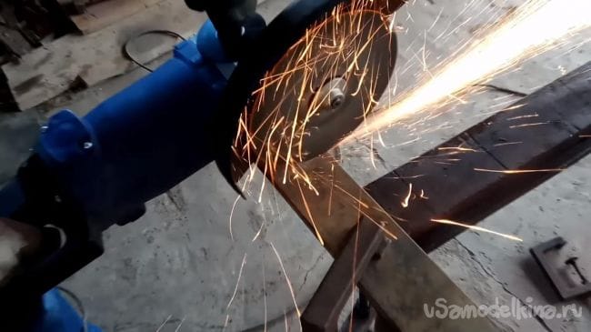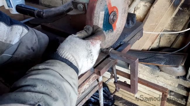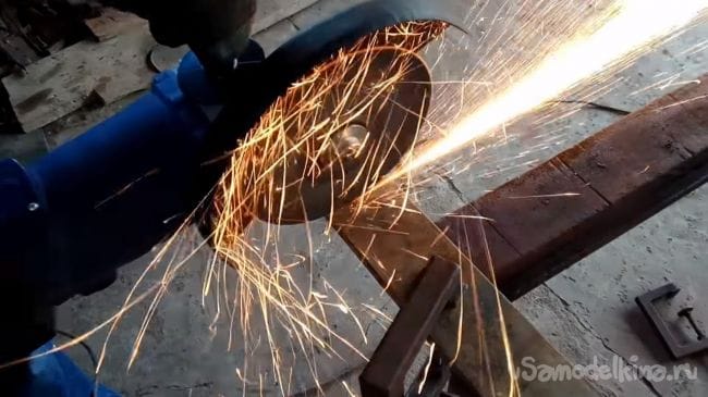 Углублять диск быстро не стоит, так как его может "закусить", поэтому делаем рез в несколько подходов. Должны получится две одинаковые по ширине пластины, из них составляем G-образную форму с углом 45 градусов, а для сварного шва делаем канавку для лучшего сваривания.