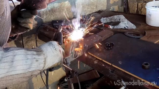 Для прочности конструкции привариваем две пластины вместе, зажав в тисках, так как рессора выгнута. В итоге толщина струбцины будет 20 мм. В местах сварки зашлифовываем поверхность при помощи шлифовального круга, установленного на УШМ.