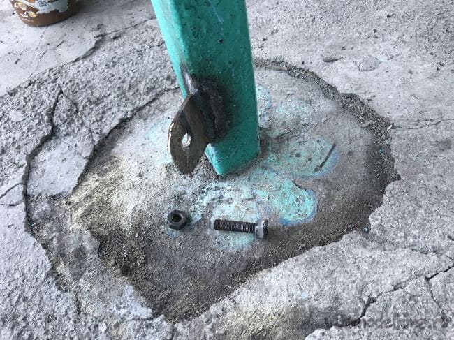 Для большей прочности привариваем уголок, соединяющий два предыдущих. С другой стороны трубы привариваем еще один уголок 50 мм и просверливаем в нем отверстия под два болта М12 и к самому уголку с внутренней стороны привариваем гайки.