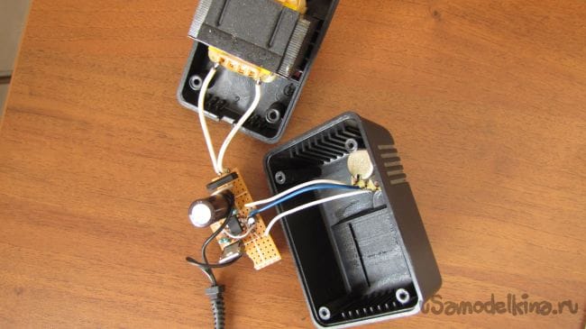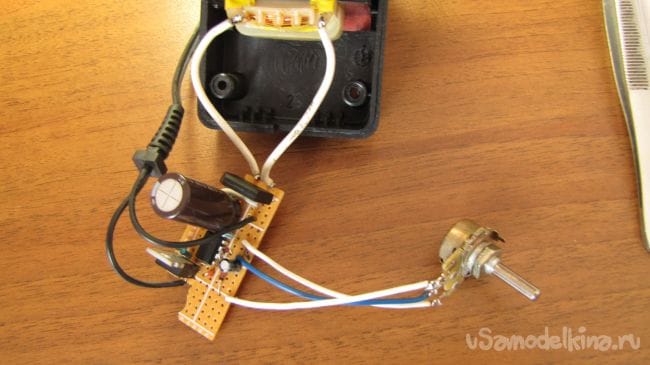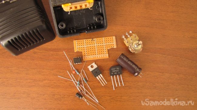 Как видите на фотографии, состоит он из трансформатора 220 вольт на 12 вольт, выпрямительного моста на четырёх диодах и сглаживающего конденсатора. Отпаиваем выпрямительный блок – он нам не понадобится. Поставим свой выпрямительный блок, вместе с регулятором, на одной плате.