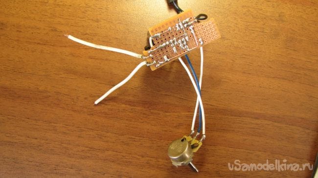 Устанавливаем детали на плату, в соответствии со схемой, начиная с самых больших элементов. Это конденсатор и потенциометр. Размещаем их в корпусе и пробуем закрывать верхнюю крышку, если ни чего не мешает, то так они и будут стоять в готовом изделии. Припаиваем с помощью любого флюса и олова.