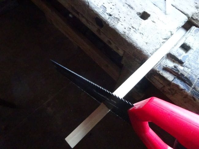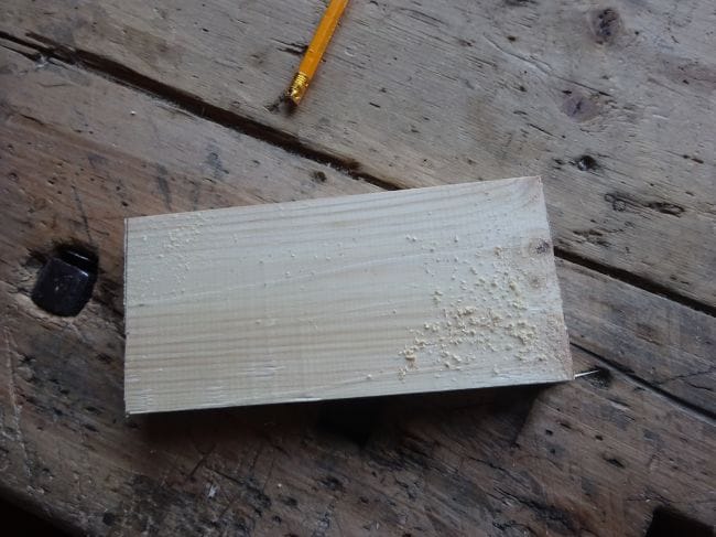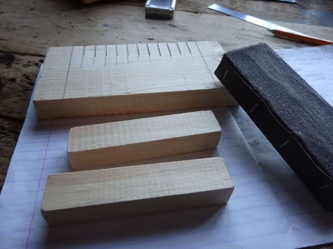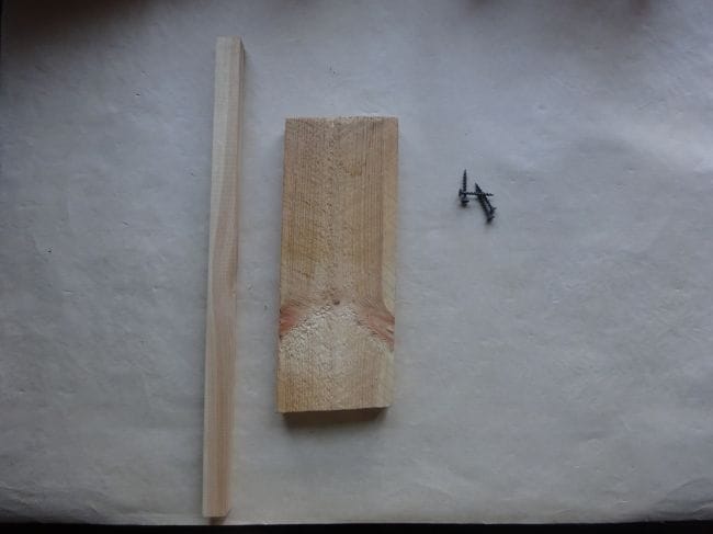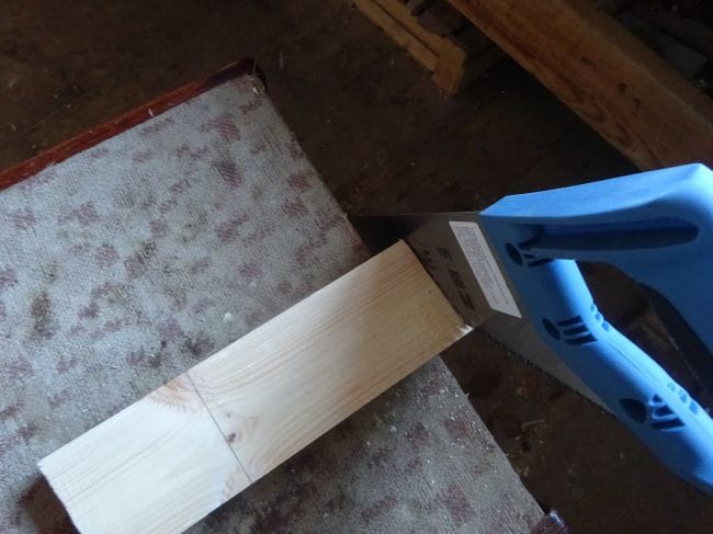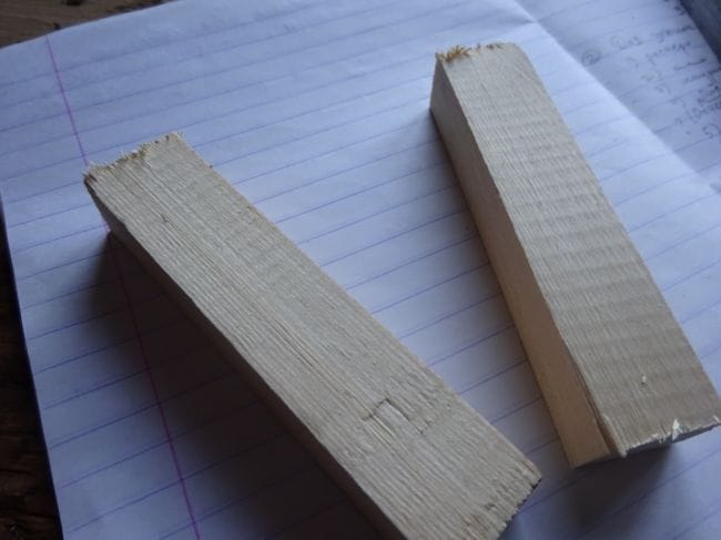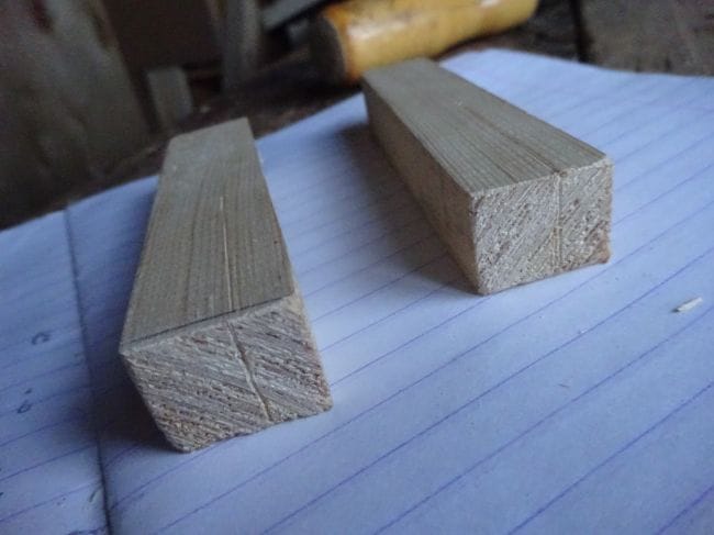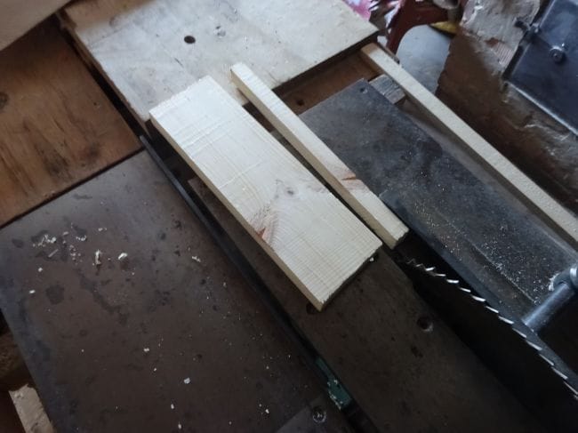 Берем подготовленную рейку и размечаем ее на две части длиной 10 см. Распиливаем. Для удаления грубых неровностей обрабатываем полученные бруски наждачной бумагой.