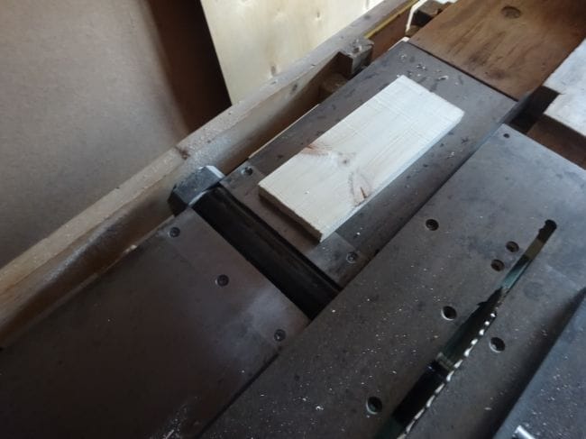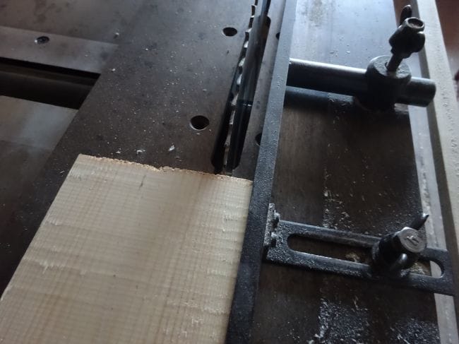 Затем опускаем приспособление примерно на 2 см. И пропиливаем вдоль торца обрабатываемой заготовки. Длина всех пропилов должна соответствовать высоте будущих шипов.