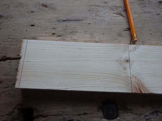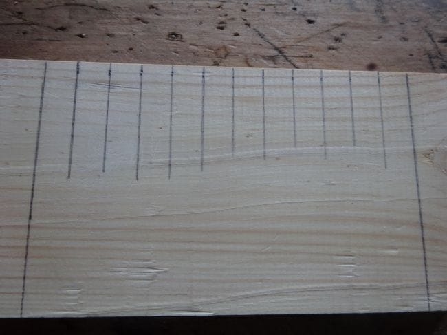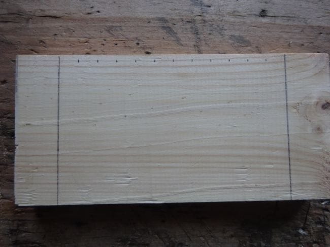 Слева и справа от торцов бруска на расстоянии примерно 2-2,5 см проводим линии (опять: с помощью угольника), рядом с которыми будут располагаться упоры. Затем с помощью линейки у верхнего края через 1см ставим точки. По угольнику проводим вниз линии, недалеко: 3 см вполне достаточно. Поворачиваем брусок, чтоб лицевой стала верхняя узкая грань. Продолжаем прежние линии, но в другую сторону. В итоге получаются параллельные линии в трехмерном пространстве.