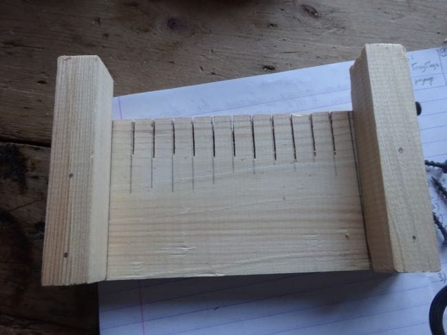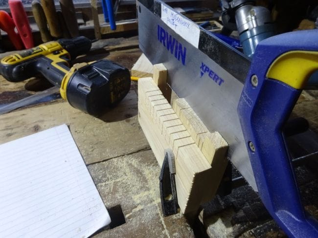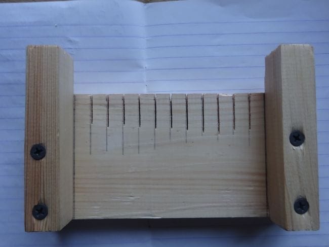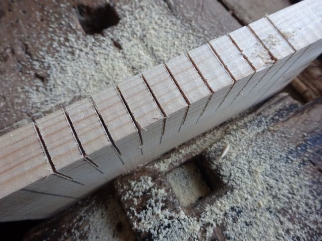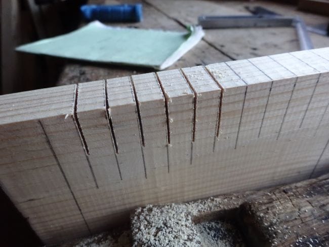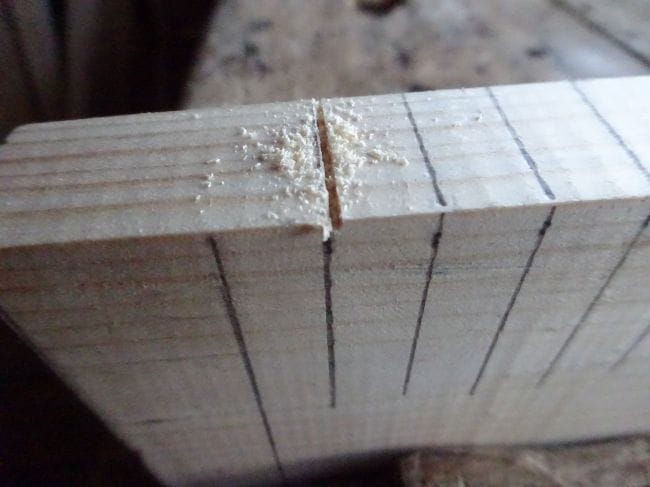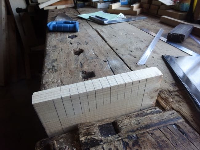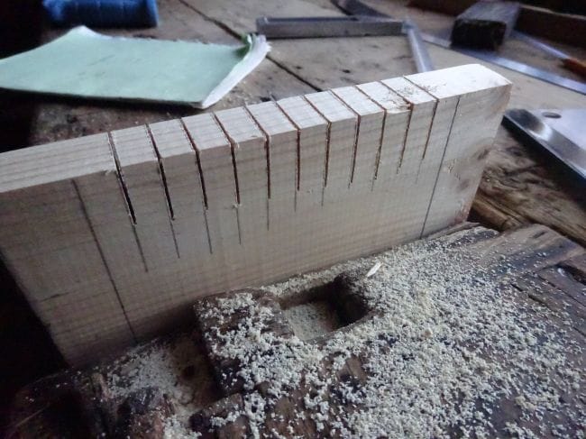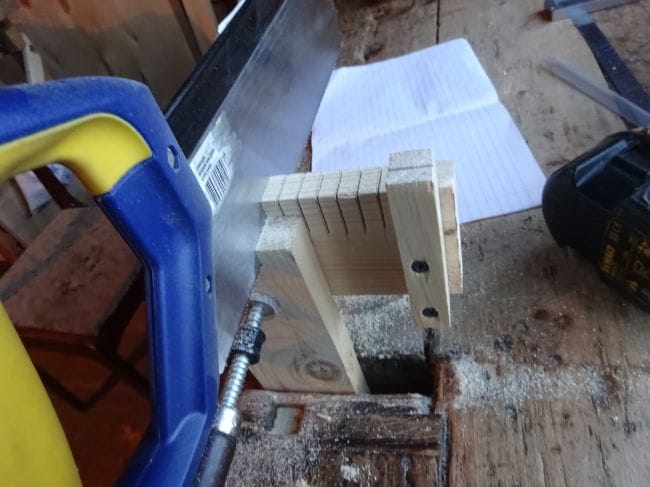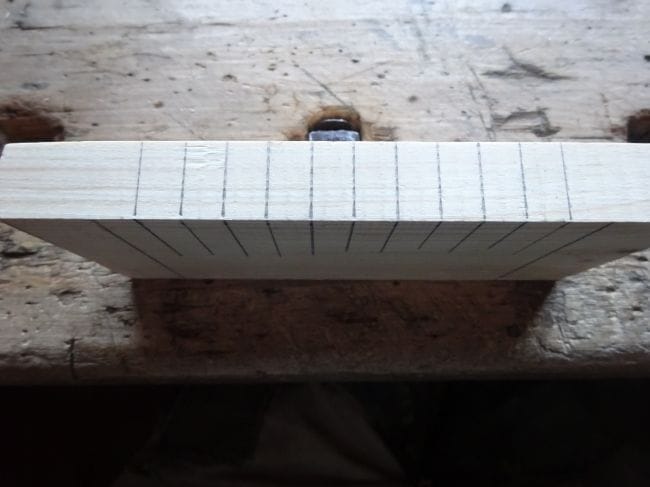Зажимаем заготовку в верстачные тиски. Обушковой пилой (ведь под нее и готовится приспособление) справа, близко с линией (чтоб лучше контролировать процесс) пилим брусок на глубину 2,5-3 см. Таких распилов получается одиннадцать.