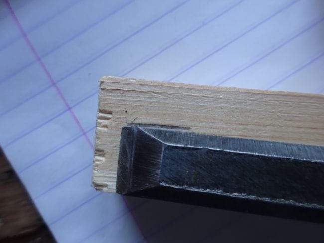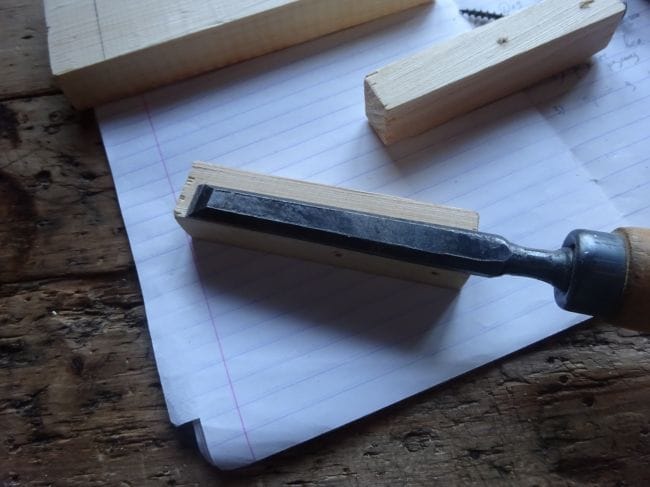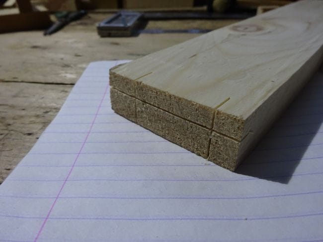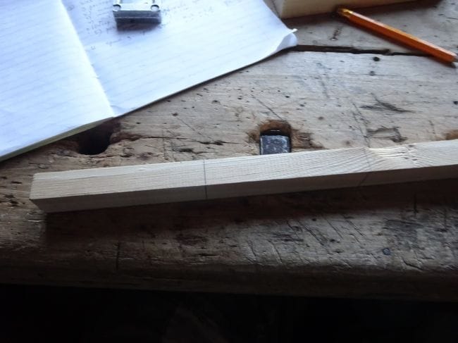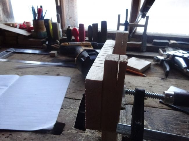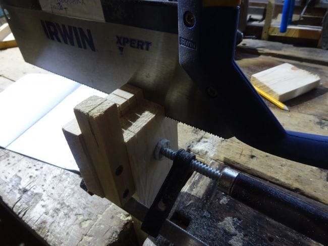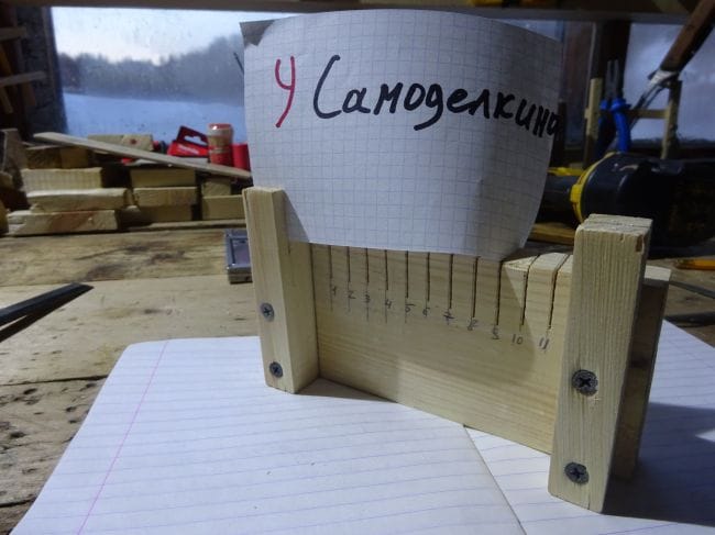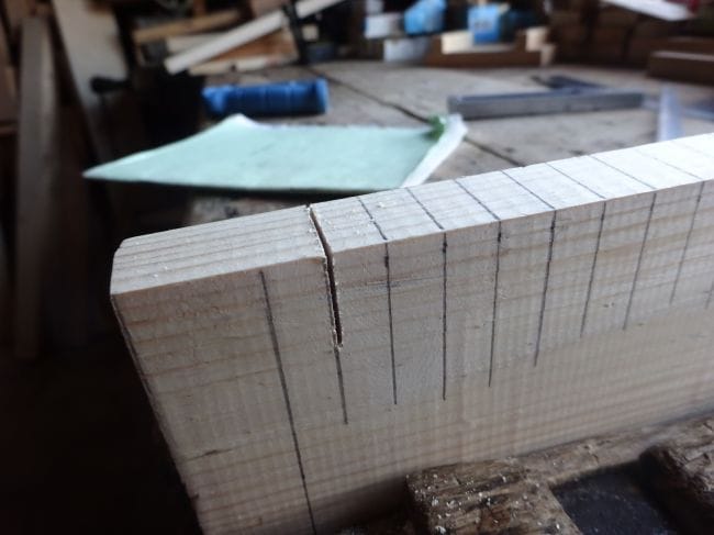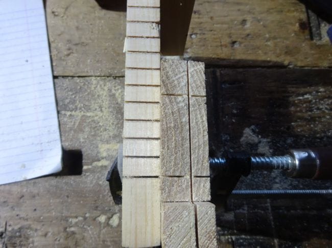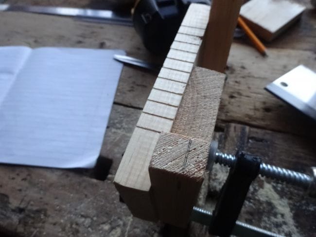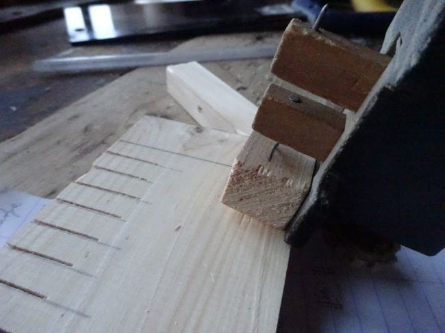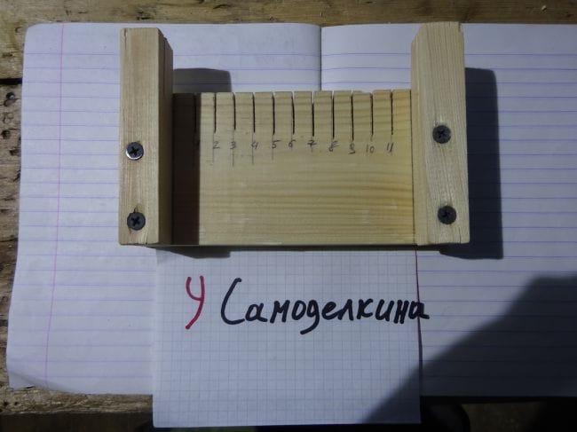 Берем второй попавшийся под руку длинный брусок, который послужит прототипом царги. Зажимаем его в тисках верстака крепко. Далее: приставляем еще не готовое приспособление левым упором к зажатому деревянному материалу так, чтобы последний был чуть ниже верхней грани главного бруска. Для более четкого выделения следов от рейсмуса можно провести карандашом по ним. Обушковой пилой идем по этим следам. Убрав пилу, обнаруживаем готовое приспособление. Для удобства подписываем цифрами номера пропилов.