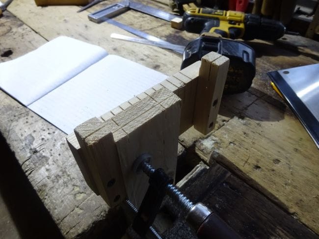 При использовании данного изделия помимо пилы будут требоваться струбцина и тиски. Зато сразу существенно облегчается работа: не надо каждую царгу проходить рейсмусом. Рекомендуется перед применением приспособления по назначению подготовить два (или больше) запасных упора, вставив их так же, как царгу, и пропилить, т. к. по мере использования пропилы в них станут расширяться, и, соответственно, ширина шипа будет непостоянной. Также следует учесть, что одиннадцать пропилов я делал не по черте, а рядом, т. е. от левого упора получились расстояния: 11, 21, 31 мм и т. д. И это стоит припомнить, когда готовится царга, прилегающая к сиденью табуретки, стула и другой подобной мебели. Мне больше важна точность размеров самого шипа.