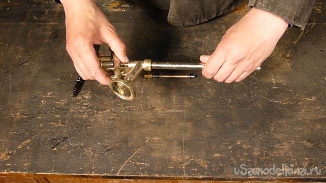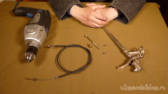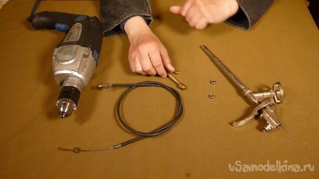 Сломанный пистолет для монтажной пены, трос от какой то двухколесной техники, маленькие подшипники и длинный винт, диаметр которого немного больше внутреннего диаметра подшипников и на резьбу которого накручивается кран Маевскоко.