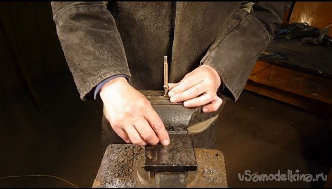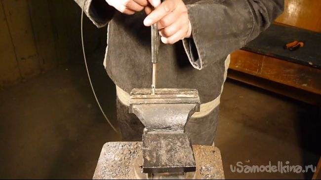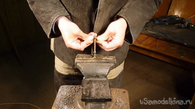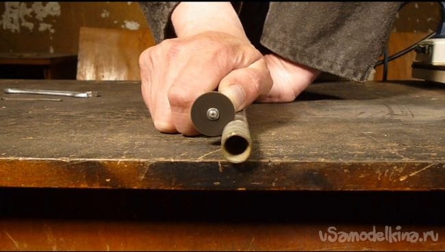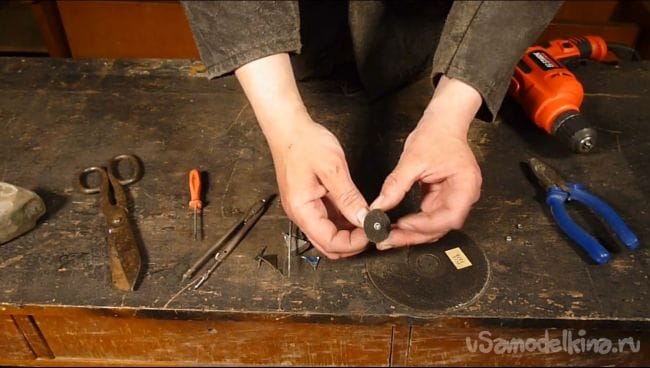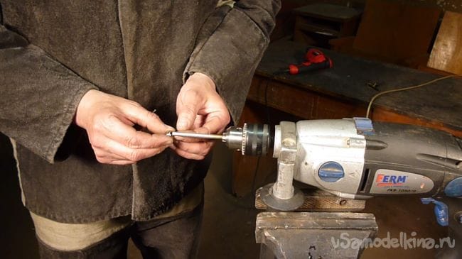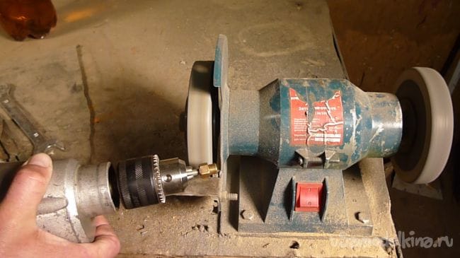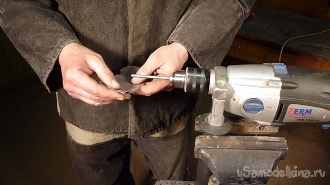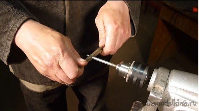 Зажимаем эту заготовку в дрель, можно и в сделанную насадку, и обтачиваем все неровности на оселке или сломанном круге от заточного станка.