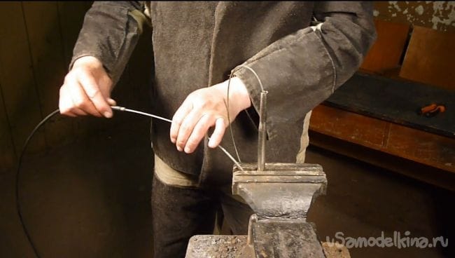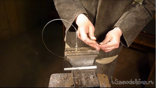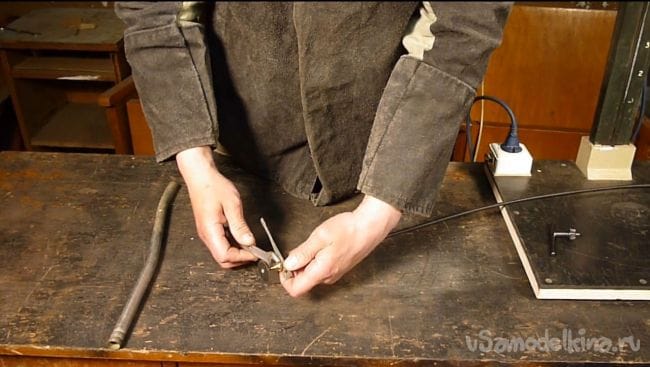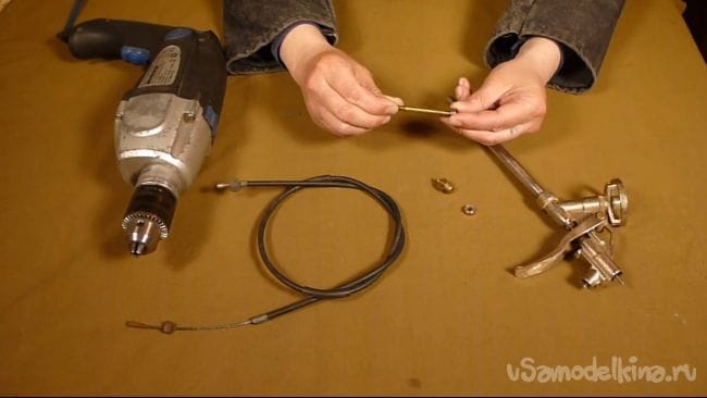 Чтобы патрон дрели не травмировал трос, одеваем на свободный край алюминиевую трубку и обжимаем ее ударами молотка.