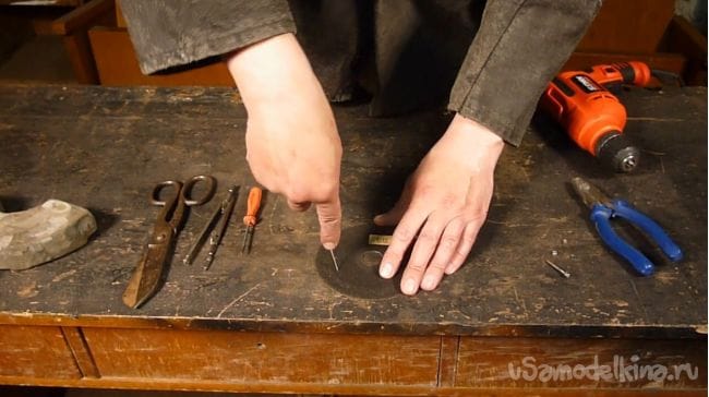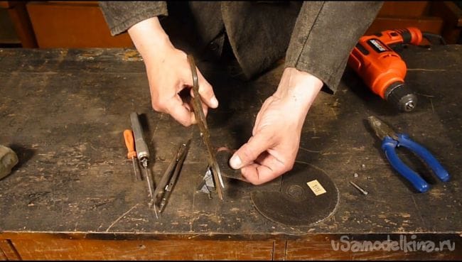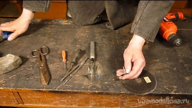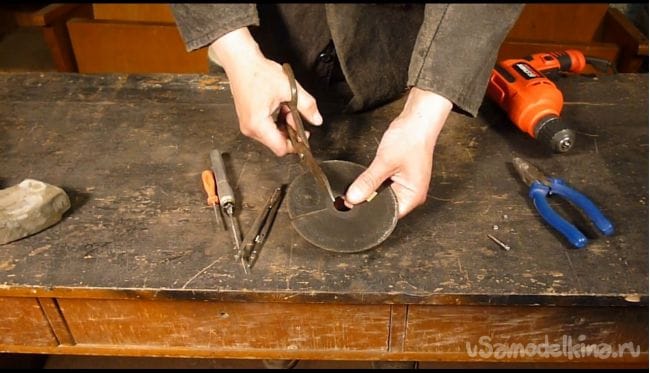 Теперь сделаем отрезной диск для этой насадки. Для этого берем стандартный отрезной диск, можно сточенный, размечаем циркулем нужный диаметр и обрезаем ножницами.