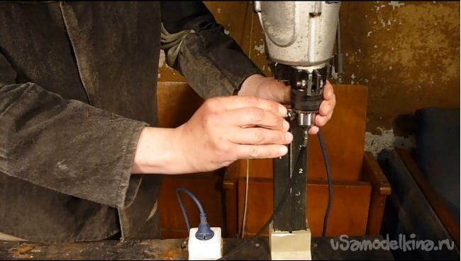 Теперь производим испытания получившейся конструкции. Зажимаем край троса в дрель, лучше конечно чтобы дрель была на стойке.
