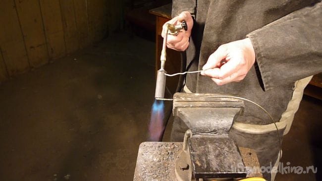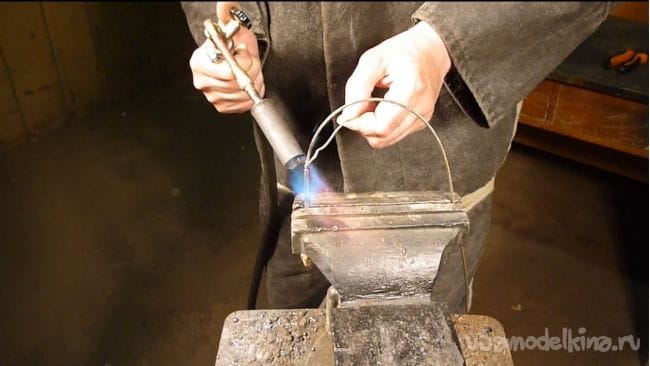 К другому краю нужно припаять трос. Для этого воспользуемся газовой горелкой и кастолином, он в разы крепче олова. Пропаиваем край троса и вставив его в отверстие припаиваем к валу. Один подшипник и медную трубку лучше снять чтобы не грелись.