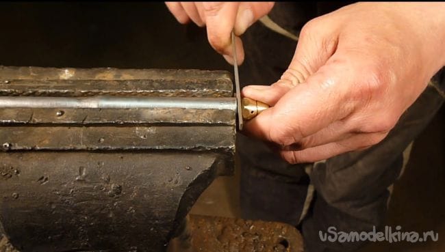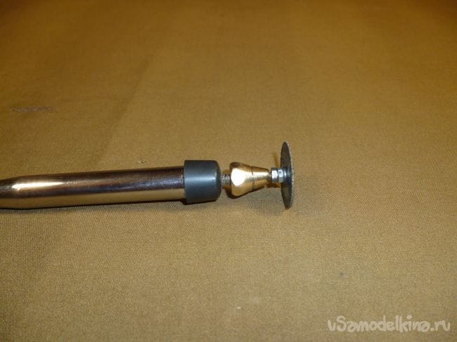 Со стороны резьбы на валу делаем цанговый зажим, два пропила крест на крест. Более подробно как его сделать есть отдельная статья и видео, кому интересно можно посмотреть.