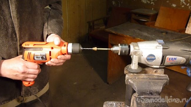 Для начала отрезаем головку винта и сверлим в торцах получившейся заготовки для вала отверстия глубиной примерно 2 см. С того края где резьба, диаметр отверстия рассчитываем под имеющиеся фрезы, с противоположного, под диаметр троса плюс небольшой запас на пайку. Для сверления лучше всего воспользоваться двумя дрелями, для лучшей центровки отверстия.