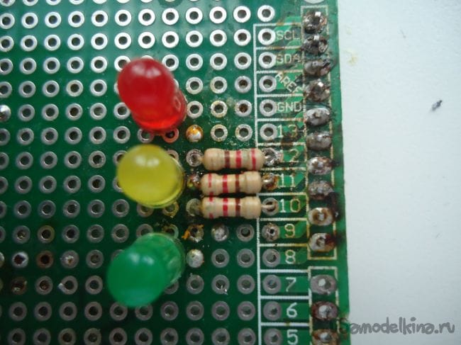делаем очень простую пайку, к 12, 11 и 10 выходу припаиваем сопротивление 220 ом и к ним светодиоды 12 - красный, 11- желтый, 10 - зеленый и все это выводим в любое GND