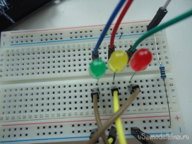 Тут все еще проще, просто как и на шилде проводим к светодиодам провода все выводим к минусу, а там добавляем сопротивление перекинув его на другой минус и там провести провод в GND.