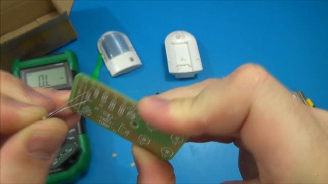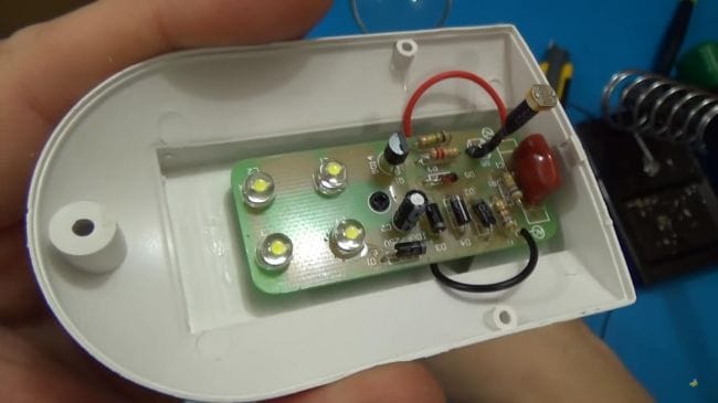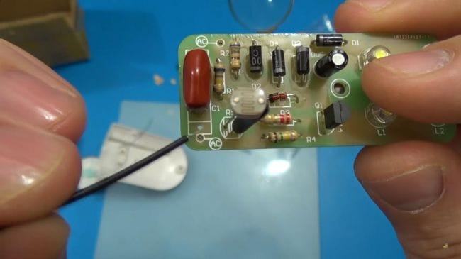 После припаивания фоторезистора переходим к проводам питания. Питается наше устройство от сети 220 вольт, на плате указано AC, куда и нужно припаять два провода под питание.