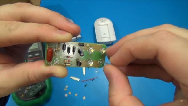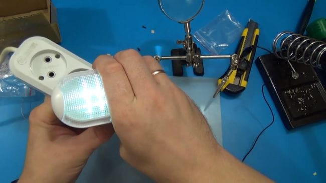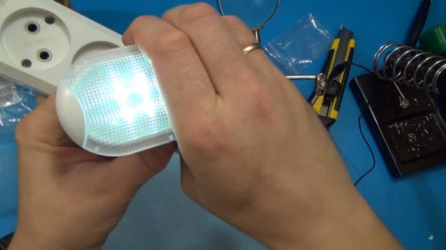 К американской вилке подбираем переходник под европейскую и втыкаем в розетку. Светодиоды не горят, но это из-за того, что в помещении горит свет, как только в комнате станет темно или же прикрыть фоторезистор рукой, то светодиоды начинают светить.