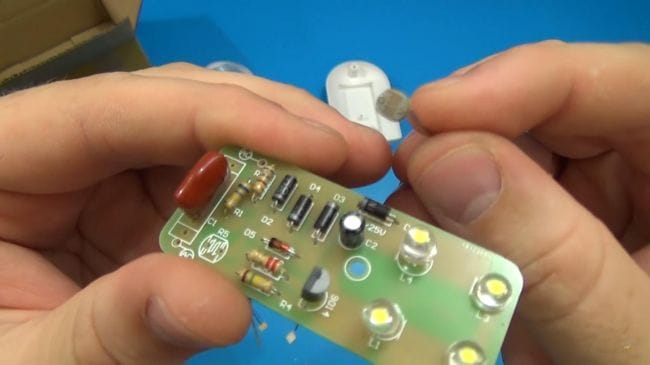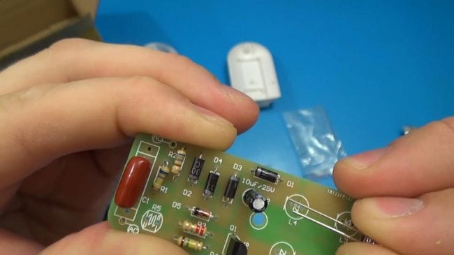 После резисторов расставляем диоды, на их корпусе есть серая полоска, которую нужно расположить в направлении с полоской на плате. Далее устанавливаем транзистор, совмещая его плоскую сторону с скосом на плате, а затем и конденсаторы, их минусовой вывод обозначен серой полоской с черточкой, на плате минус это заштрихованный полукруг.