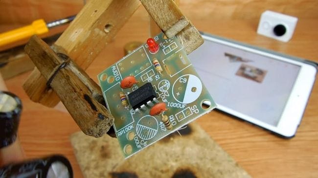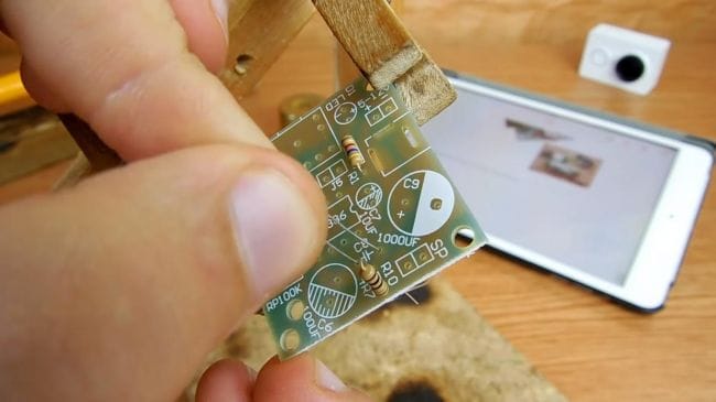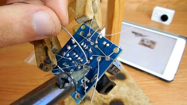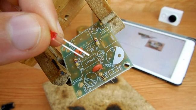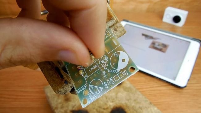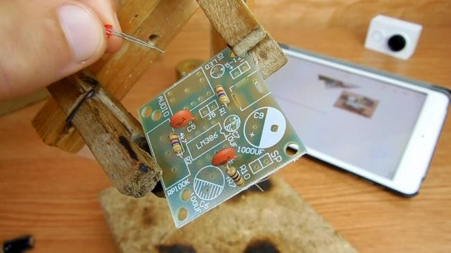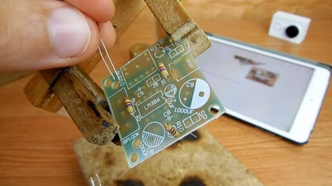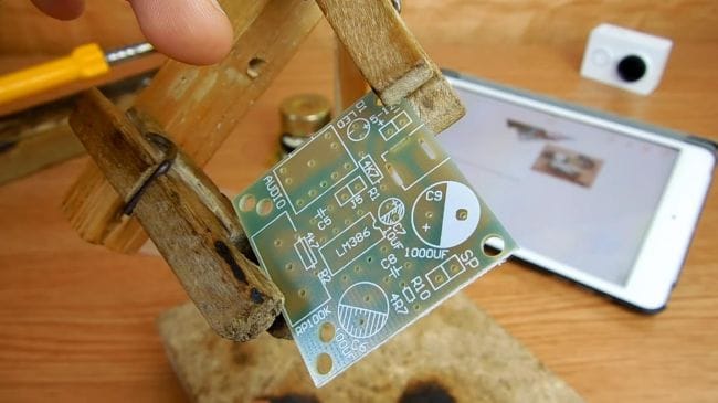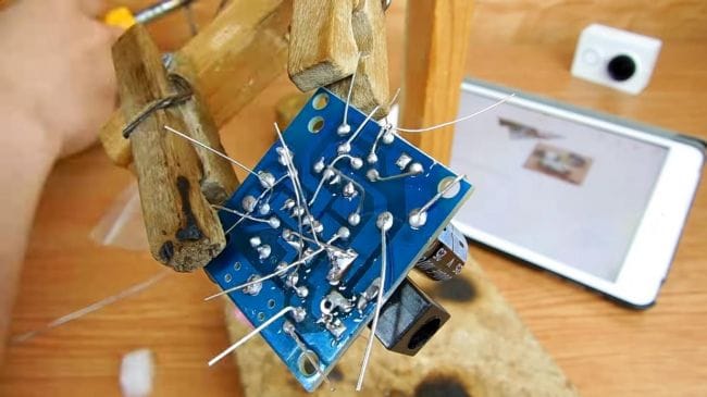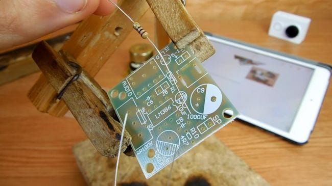 Фиксируем плату при помощи самодельного зажима, также хорошо подойдет для этих целей приспособление "третья рука".