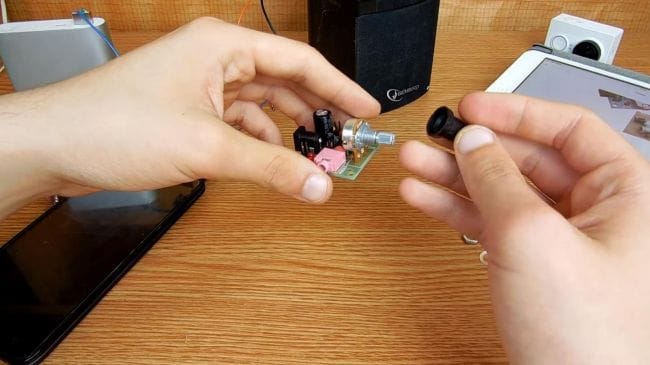 Для того, чтобы на нашем самодельном усилителе можно было регулировать уровень громкости, нужно установить переменный резистор, к которому в комплекте есть специальная ручка для удобства и красоты.