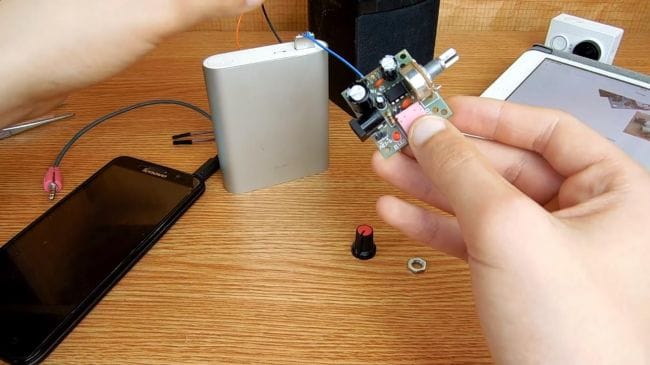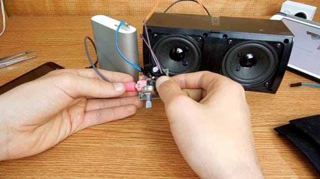 Подключаем повербанк к усилителю и подаем на вход звук с телефона, для этого нужен будет провод AUX, с двух сторон которого есть штекер 3.5 мм.