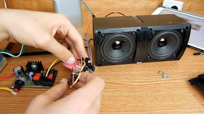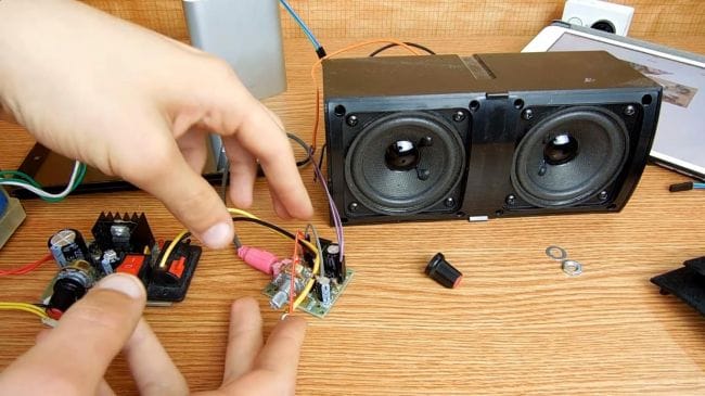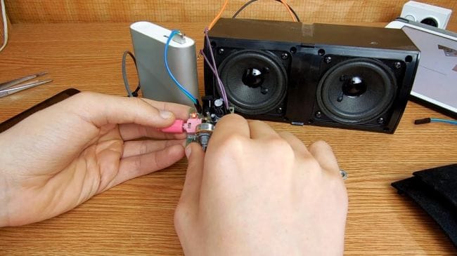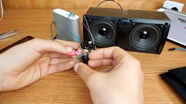Как оказалось, звук с данного динамика идет посредственный, поэтому пробуем с колонками помощнее. Для лучшего качества звука усилителю нужно питания 12 вольт, так количество шумов уменьшается, а при максимальной громкости присутствуют небольшие хрипы, но не такие выразительные, как при подключении питания 5 вольт от повербанка.