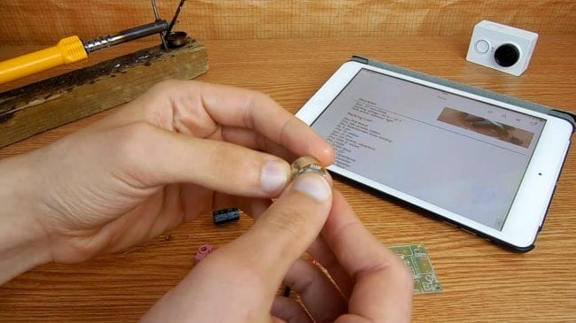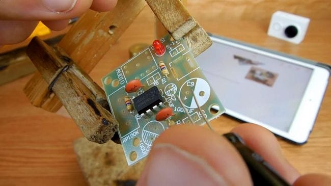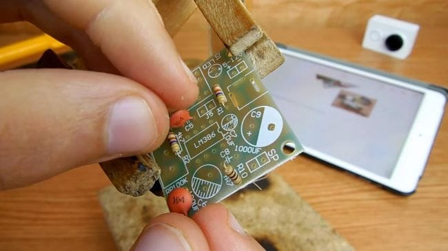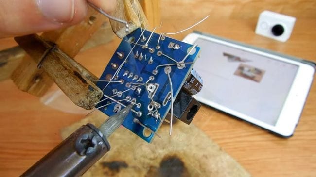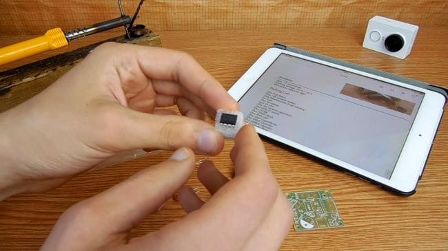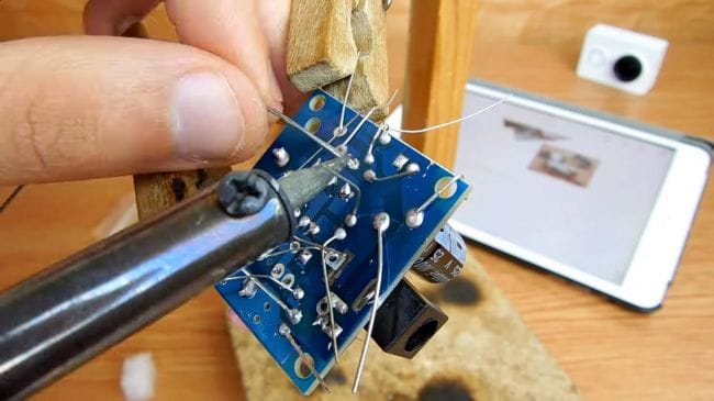 Пришло время припаивать детали. Переворачиваем плату и фиксируем в зажиме для пайки. Наносим флюс на контакты и при помощи паяльника припаиваем компоненты, по мере необходимости добавляем припой. При пайке микросхемы делайте это как можно быстрее, старайтесь не перегревать выводы, иначе микросхема может выйти из строя.