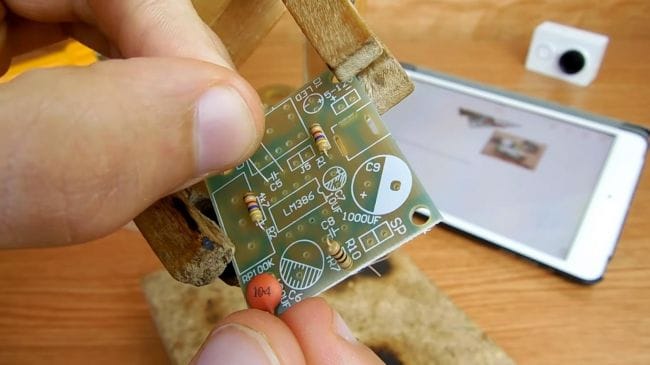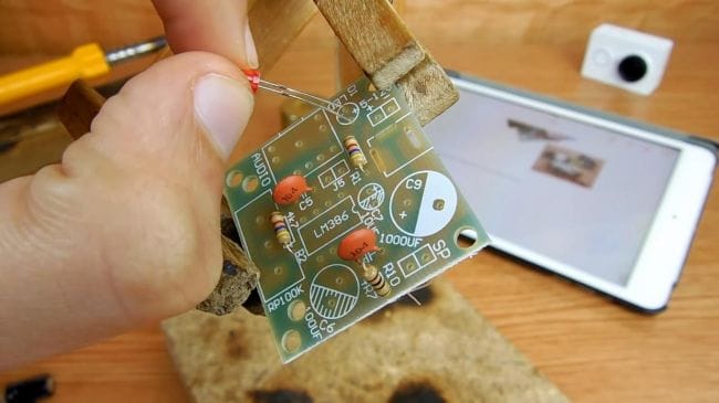 Также не забываем установить гнездо под штекер 3.5 мм и гнездо для подключения питания. Устанавливаем выводы под питание и переходим дальше. Чтобы детали на следующем этапе не выпали, подгинаем их выводы.