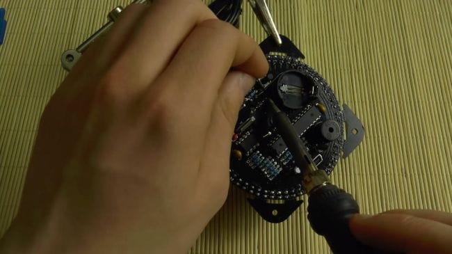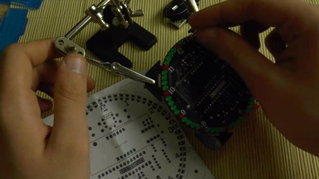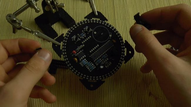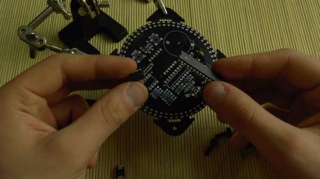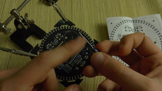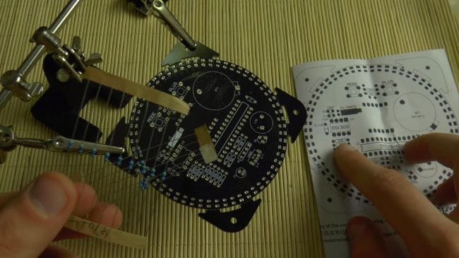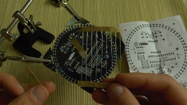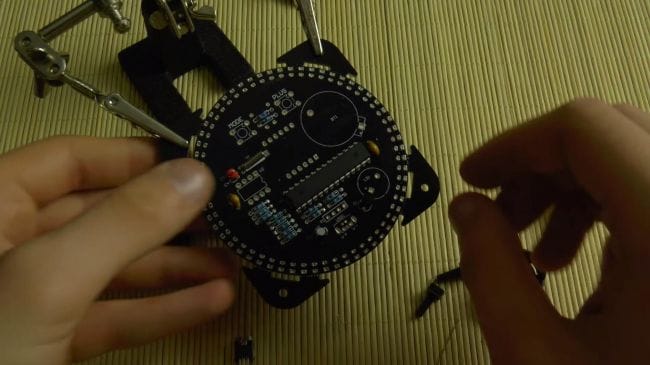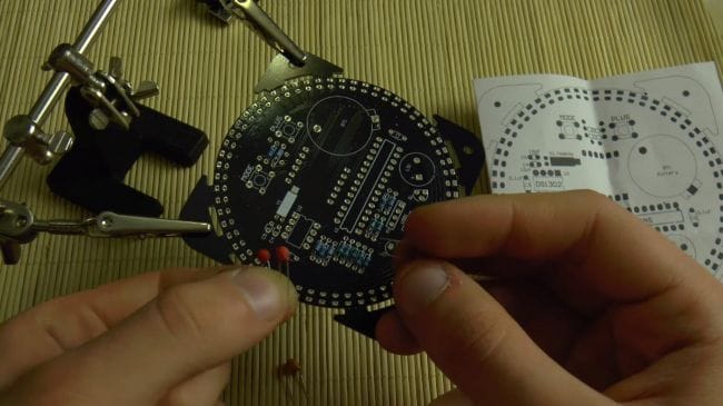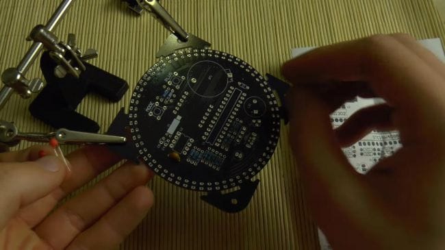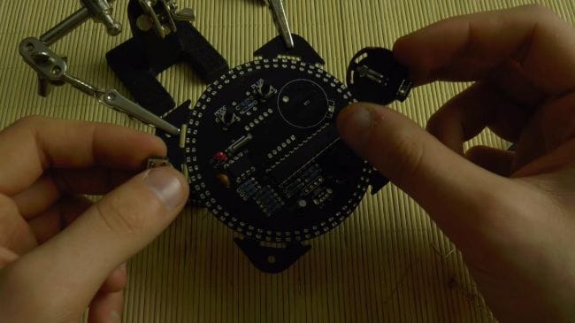 Для того, чтобы при пайке все компоненты не выпали, подгинаем их выводы. Затем закрепляем плату в "третьей руке" и припаиваем при помощи паяльника контакты, заранее нанеся на место пайки флюс.