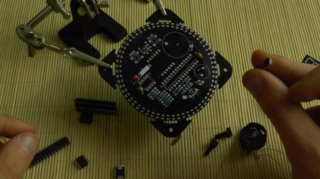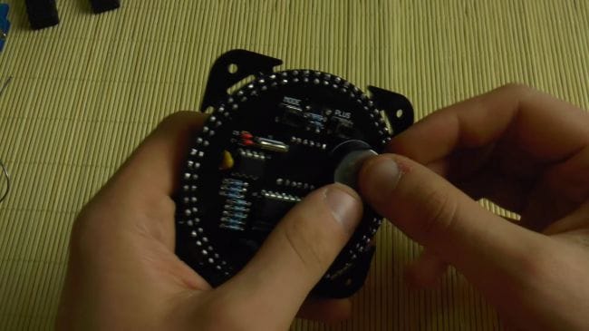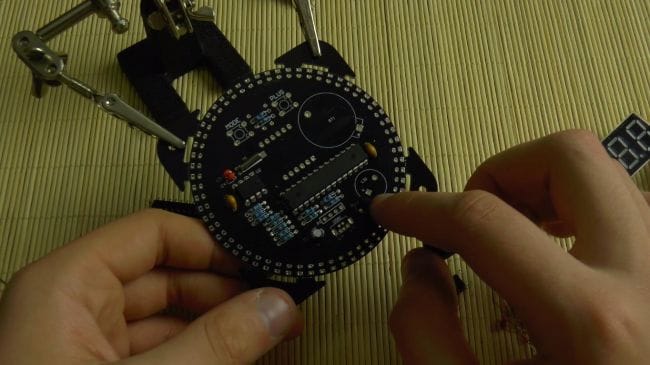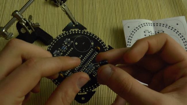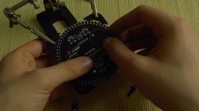 Далее ставим динамик, так как часы имеют функционал будильника, то и излучатель звука тут тоже нужен. Для его установки на корпусе указан плюсовой вывод, как и на плате. Также не забывает поставить две кнопки для настройки часов.
