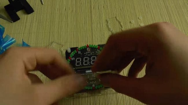 Далее припаиваем к плате цифровое табло с светящимися цифрами, термо и фоторезистор. Последние два необходимо вывести не некоторое расстояние, чтобы они находились за пределами корпуса.